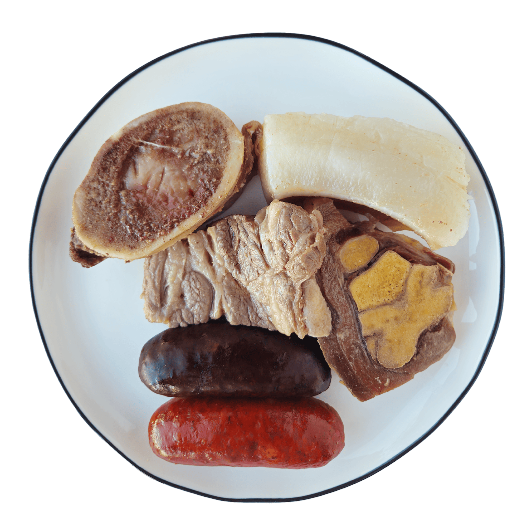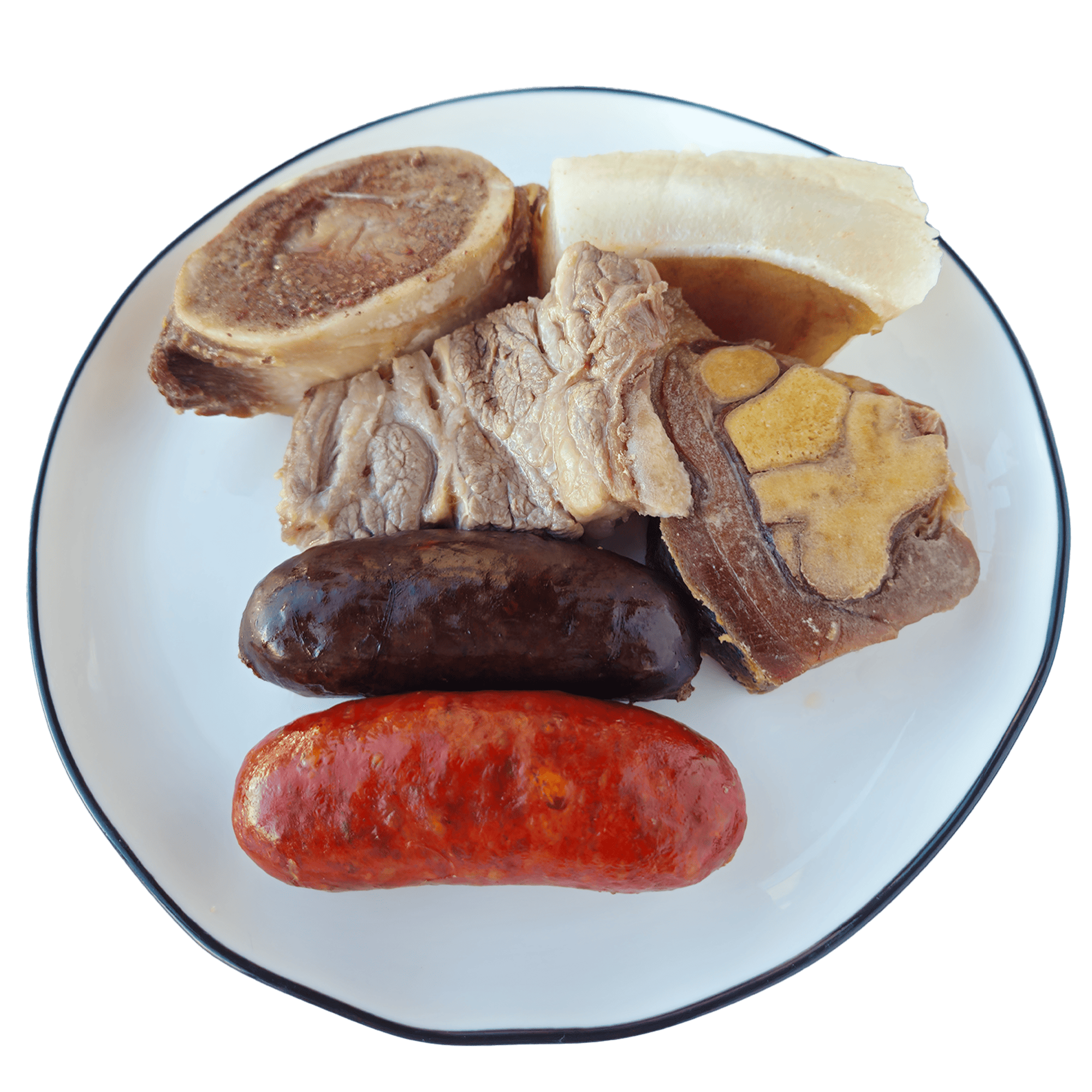 Ingredientes: Falda de añojo (Falda de vacuno), Punta de jamón (Jamón de cerdo, sal, azúcar, conservadores E-252, E-250, antioxidantes E-301, E-331), Hueso de añojo, Tocino ibérico salado: (Tocino de cerdo ibérico y sal), Morcilla al humo de Haya (Grasa y carne de cerdo, agua, sangre de cerdo, cebolla, pimentón, dextrina, proteína de cerdo, dextrosa, sal, fibra de TRIGO sin gluten, aroma, aroma de humo,especias, extracto de romero y tripa de cerdo), Chorizo al humo de Haya Oreado (Carne y grasa de cerdo, pimentón, especias, sal, dextrosa, fibras vegetales (de TRIGO sin gluten, guisante y cítrica), proteína de cerdo, emulgentes E-451, E-450, antioxidantes E-300, E-301, E-331, azúcar, conservador E-252, colorante E-120, extracto de pimentón, aroma de humo, aromas y tripa de cerdo. Tratado con sorbato potásico).